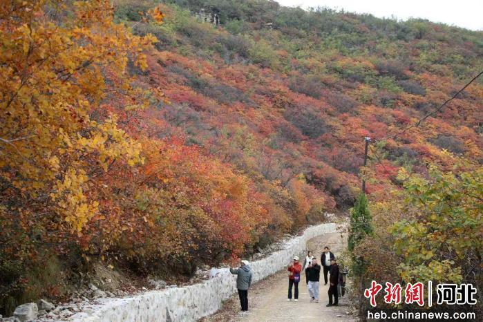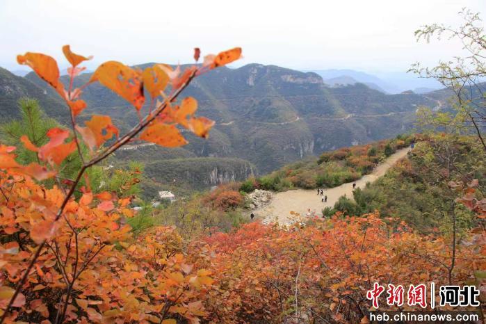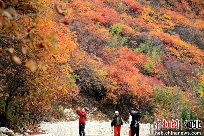 中新网河北新闻10月29日电 (王天译 王海波)29日,位于太行山东麓的河北省武安市百里画廊贺进镇三门扇红叶观赏地,漫山遍野的红叶,恰似绚丽的红锦,壮丽迷人,成为游客争相游览的打卡地。